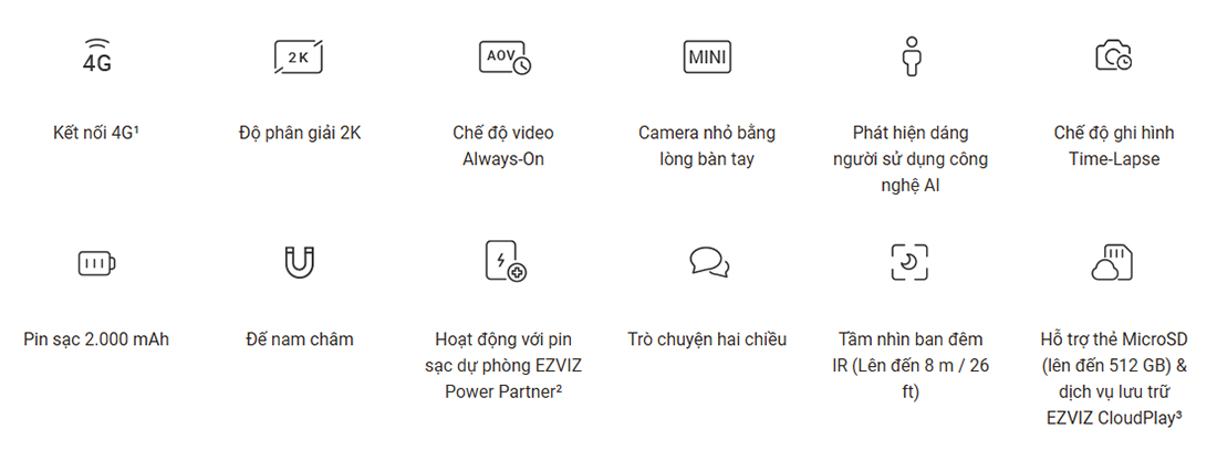 - Lưu trữ: Thẻ nhớ microSD (tối đa 512GB) hoặc đám mây EZVIZ CloudPlay