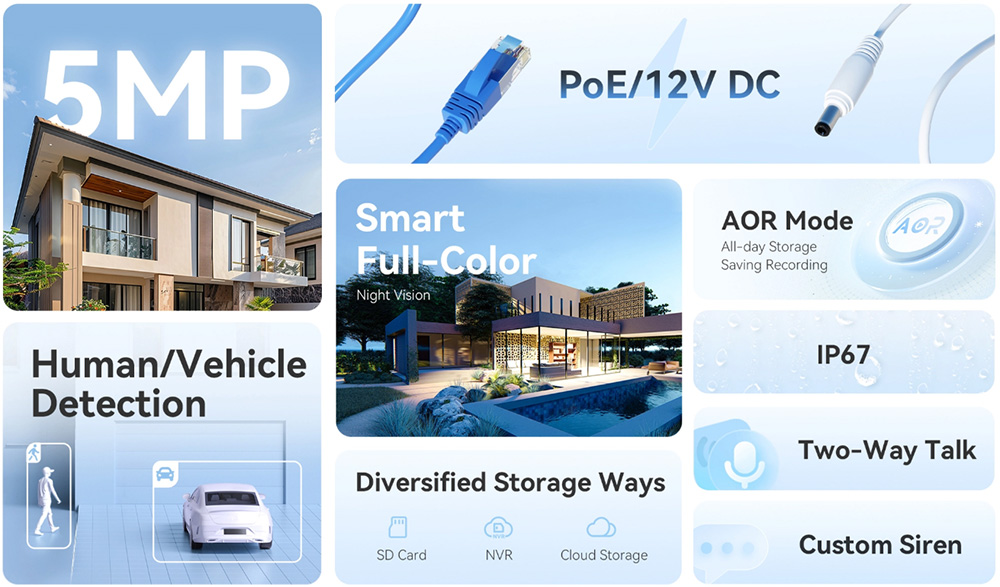 Camera IMOU IPC-PS3EP-5M0 mang đến hình ảnh siêu nét 5MP (khoảng 3K), giúp bạn dễ dàng quan sát chi tiết khuôn mặt hay biển số xe. Tích hợp nguồn PoE, mic và loa để đàm thoại hai chiều thuận tiện. Camera có đèn LED ban đêm màu và còi báo động chủ động, tạo lớp răn đe mạnh mẽ. Với công nghệ IMOU SENSE nhận diện người và phương tiện, thiết bị cảnh báo thông minh, giảm báo động giả. Thiết kế vỏ nhựa và chuẩn IP67 đảm bảo độ bền cao khi lắp ngoài trời.