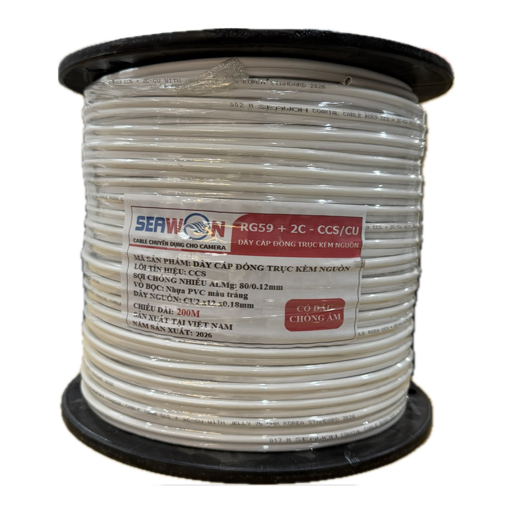 Dây cáp đồng trục SEAWON RG59+2C là giải pháp tối ưu cho hệ thống camera giám sát analog như TVI, AHD, CVI, mang lại tín hiệu ổn định và hình ảnh sắc nét. Sản phẩm tích hợp cả dây tín hiệu và dây nguồn trong cùng một sợi, giúp thi công nhanh gọn, tiết kiệm chi phí và thời gian lắp đặt. Với lõi dẫn chuẩn 18AWG, lớp chống nhiễu tốt và độ bền cao, cáp đảm bảo truyền dẫn hiệu quả trong nhiều môi trường. Sản phẩm chính Hãng phân phối bởi Siêu thị Điện thông minh, cam kết chính hãng, phù hợp cho mọi công trình camera chuyên nghiệp.