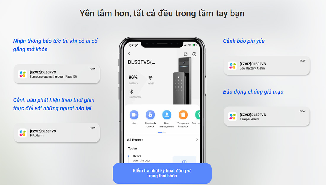 Nhận diện khuôn mặt gia đình không phải là cách duy nhất DL50FVS mang đến sự an toàn. Bên cạnh đó, thiết bị còn sở hữu một trong những phương thức mở khóa linh hoạt nhất hiện nay