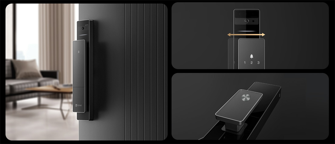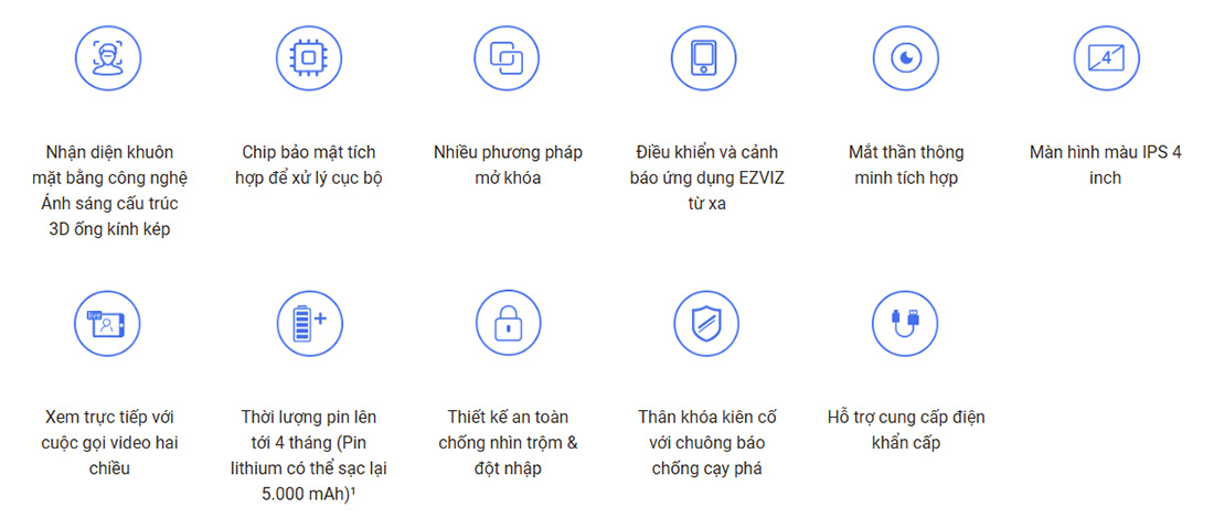 • Phương thức mở khóa đa dạng: Khuôn mặt, vân tay, mật mã, thẻ cảm ứng, chìa cơ, bluetooth qua ứng dụng EZVIZ, mã tạm thời, mở khóa từ xa.