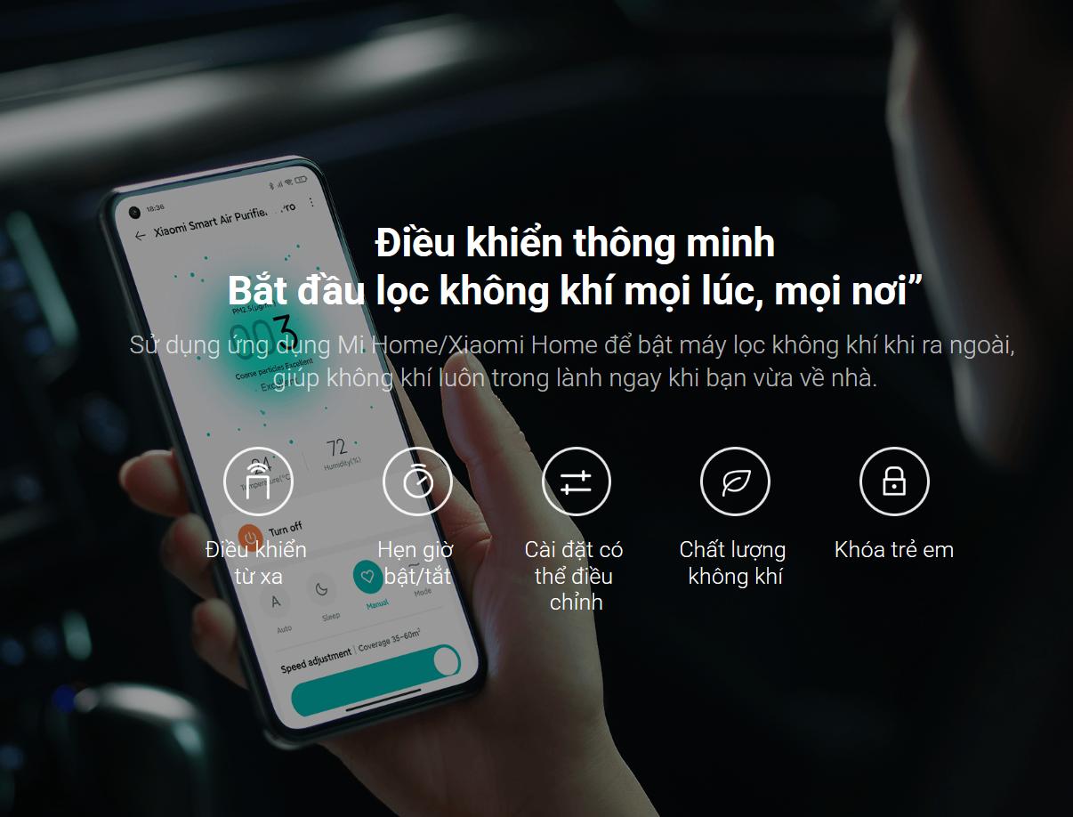 • Tính năng thông minh: tự động điều chỉnh tốc độ quạt theo mức ô nhiễm, cảnh báo thay lõi lọc, báo điểm chất lượng không khí, cập nhật firmware qua ứng dụng
