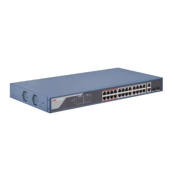 • 24 cổng PoE RJ45 100Mbps, 2 cổng RJ45 Gigabit, 2 cổng quang