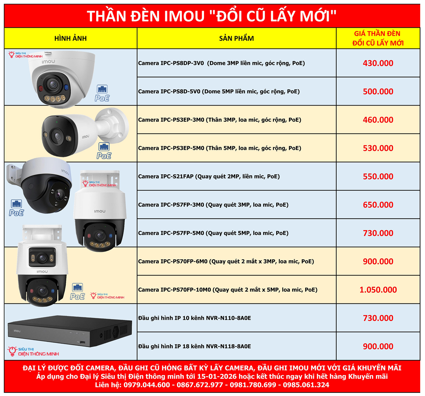 Nhằm hỗ trợ khách hàng trải nghiệm công nghệ mới và nâng cấp hệ thống camera cũ, IMOU triển khai chương trình ưu đãi đặc biệt “Thần đèn IMOU – Đổi cũ lấy mới”. Theo đó, khách hàng có thể đổi camera hoặc đầu ghi cũ hỏng của bất kỳ hãng nào để mua camera IP POE và đầu ghi NVR IMOU chính hãng với mức giá ưu đãi hấp dẫn (1 đổi 1 theo giá ưu đãi)